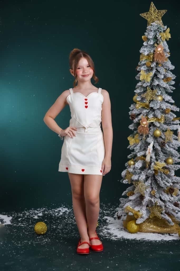 O Conjunto Celebration é confeccionado em brim com toque aveludado, garantindo durabilidade e conforto. Composto por blusinha com formato de coração, possui regulagem na alça e lastex nas costas para melhor ajuste. A saia vem com shortinho por baixo, bolsinho nas laterais e bolsinho fake nas costas, unindo estilo e praticidade para o dia a dia.
